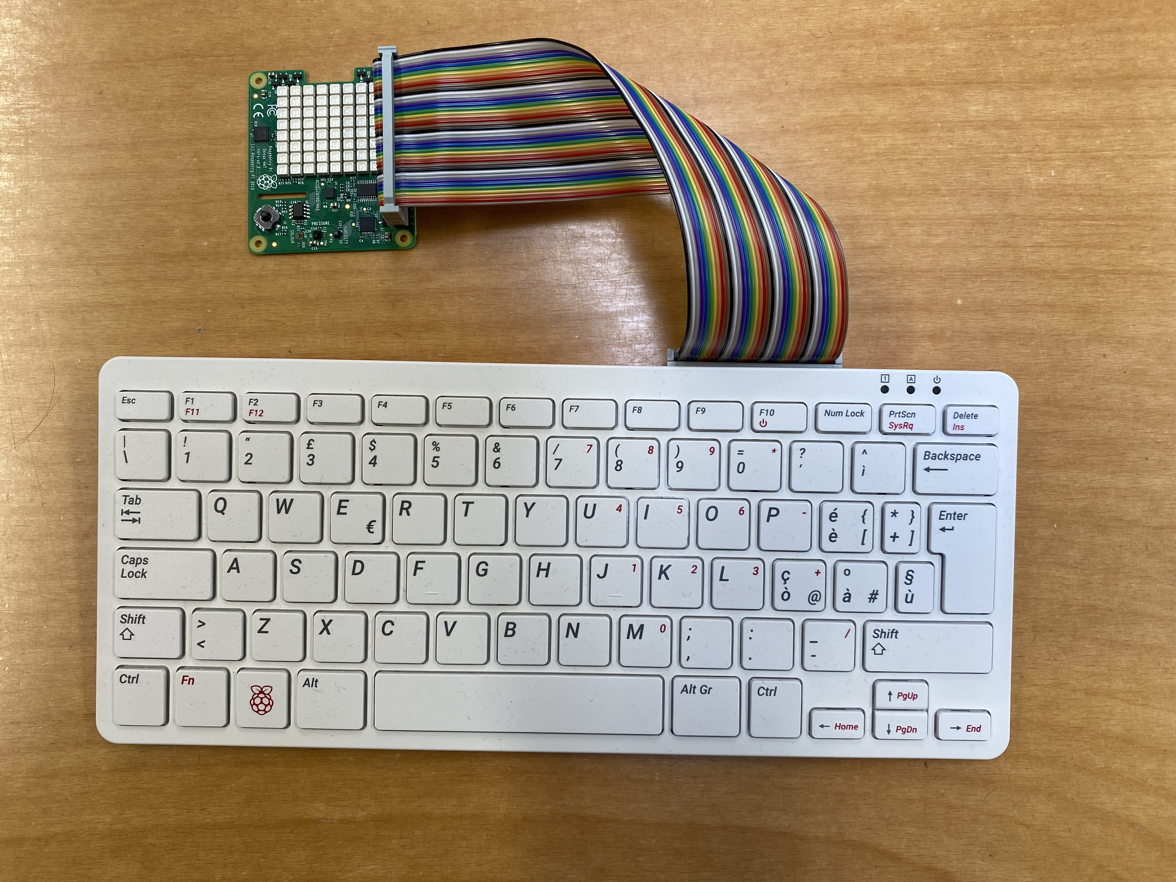 Verwende ein 40-Pin GPIO-Kabel und verbinde den Sense Hat mit der Verbindung des Pi 400. Dafür musst du zuerst die schwarze Abdeckung auf der Rückseite entfernen.